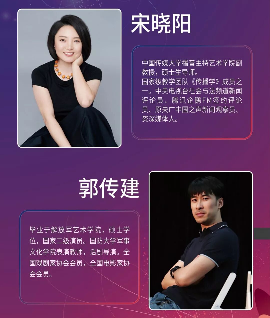 · 著名相声表演艺术家,北京文联副主席,中国曲艺家协会主席-李金斗; · 光线传媒主持人,视频部总监-李程远; · 中央人民广播电台播音指导-王晓澄; · 中国传媒大学播音主持学院教授-宋晓阳; · CCTV新闻频道节目主持人-张泰源; · 北京电台主持人,北大艺术硕士-刘佳; · 国防科技大学军事文化学院表演教师,话剧导演-郭传建; · 中心高级讲师,国家一级播音员-刘雪宁, 作为本次大师班讲师。带领学员登顶语言艺术殿堂,分享口才魅力。本次大师班师资培训为期三天,是青少儿普通话与口才培训中心为所有口才教育工作者开展的名师教学专项培训活动,讲师背景雄厚,活动环节设置多样。并在培训后颁发结业证书。
